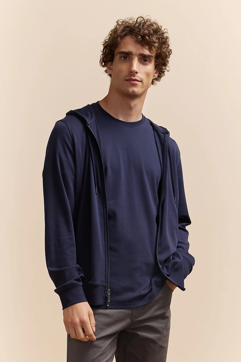 Ce cardigan à capuche en coton pima est lallié parfait pour allier confort et style dans votre garde-robe. Confectionné avec le meilleur coton pima, célèbre pour sa douceur et sa robustesse, il vous assure une sensation de bien-être tout au long de la journée. Son design épuré et sa teinte marine polyvalente en font un vêtement facile à assortir avec presque tous vos tenues, que ce soit pour se prélasser chez soi ou pour sortir. Enfilez ce cardigan et laissez-vous séduire par un mélange de raffinement et de praticité irrésistible.