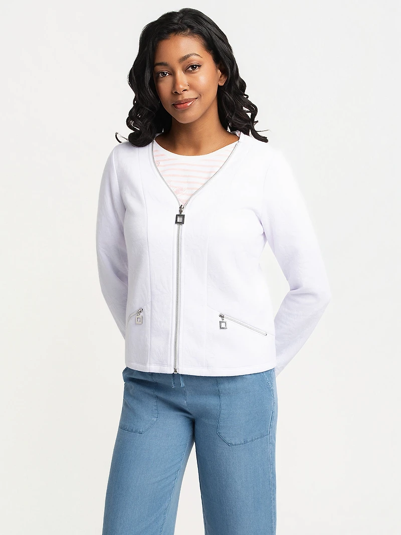 Veste zippée à manches longues dotée d'une fermeture à glissière centrale, deux poches zippées sur le devant et une longueur aux hanches.