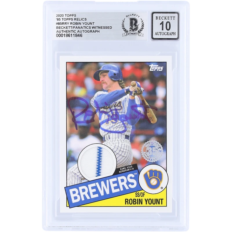 Carte autographiée de Robin Yount (Milwaukee Brewers) Topps '85 Relics 2020 n° 85R-RY, authentifiée par Beckett Fanatics Witnessed (n° 10).Carte autographiée de Robin Yount (Milwaukee Brewers) Topps '85 Relics 2020 n° 85R-RY, authentifiée par Beckett Fanatics Witnessed (n° 10).Carte autographiée de Robin Yount (Milwaukee Brewers) Topps '85 Relics 2020 n° 85R-RY, authentifiée par Beckett Fanatics Witnessed (n° 10).