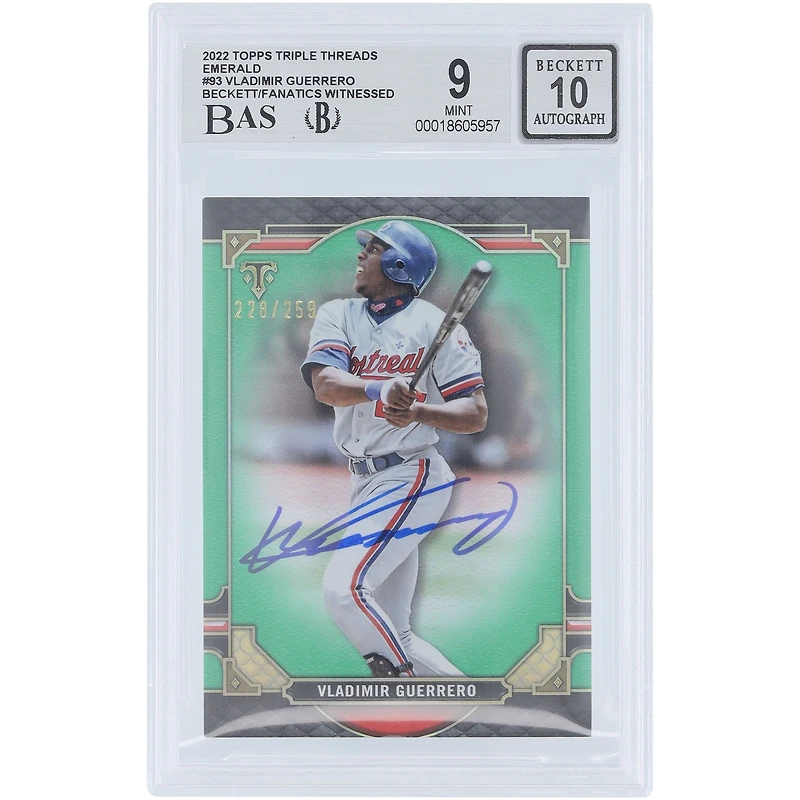 Carte autographiée de Vladimir Guerrero (Expos de Montréal), série Topps Triple Threads Emerald 2022, numéro 93/259, authentifiée par Beckett Fanatics Witnessed (note 9/10).