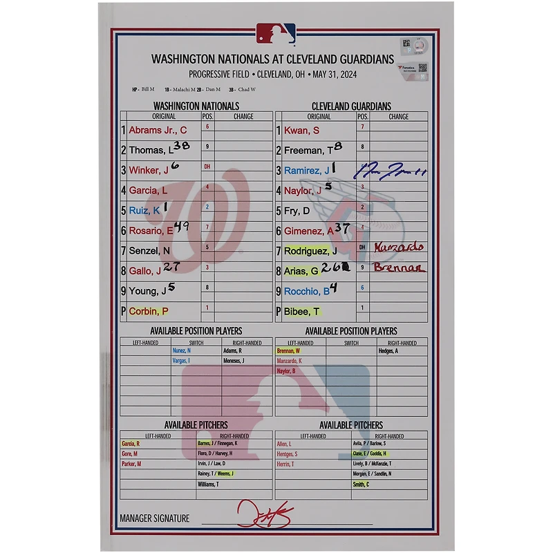 Carte de composition d'équipe dédicacée de Jose Ramirez par les Cleveland Guardians lors du match contre les Washington Nationals le 31 mai 2024