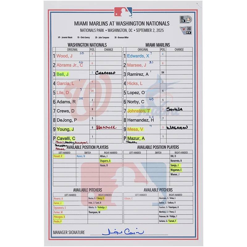 Enrichissez votre collection de souvenirs des Nationals de Washington avec cette carte d'alignement utilisée lors du match contre les Marlins de Miami. Cette carte authentique illustre les décisions stratégiques prises le 2 septembre 2025. Obtenue grâce au Programme d'authentification de la Ligue majeure de baseball, cette pièce de collection est un incontournable pour les fans passionnés souhaitant posséder un souvenir tangible du match.