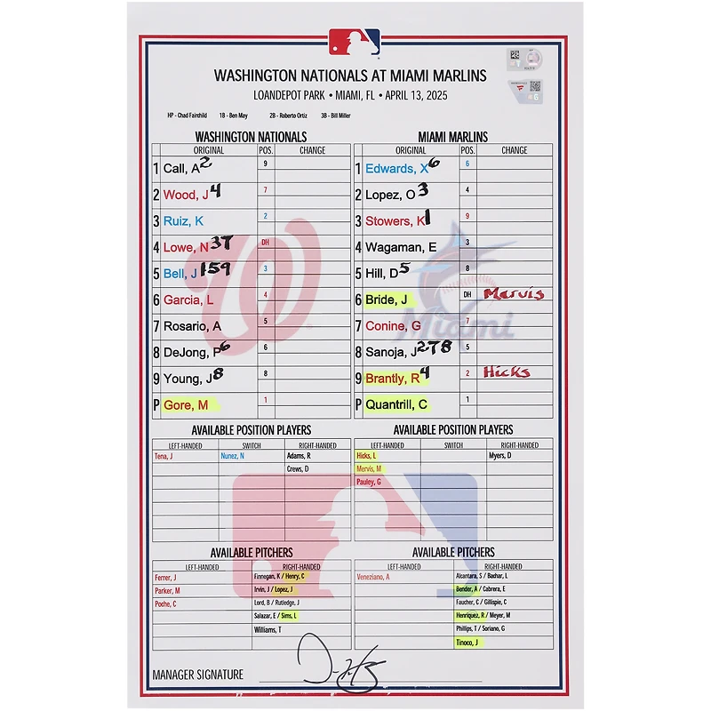 Ajoutez un souvenir authentique à votre collection des Nationals de Washington en vous procurant cette carte de composition d'équipe utilisée lors du match. Avec ses détails authentiques sur les joueurs et les matchs de leur match contre les Marlins de Miami le 13 avril 2025, c'est un incontournable pour tout fan des Nationals de Washington ou collectionneur MLB averti. Cet article comprend également un hologramme numéroté et inviolable, vérifiable en ligne pour en certifier l'authenticité.
