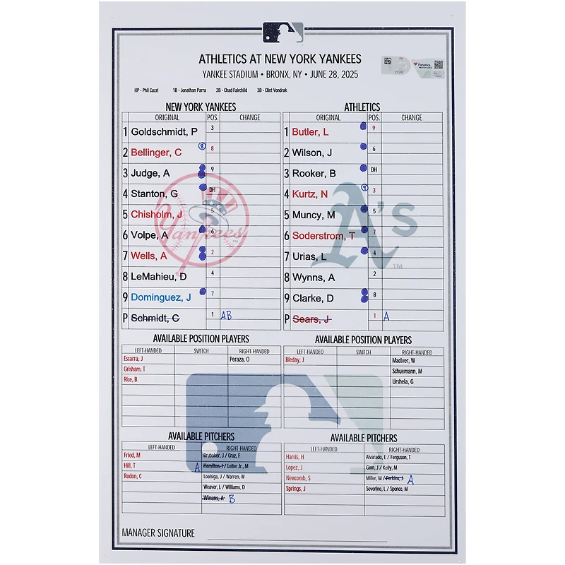 Carte de composition des Yankees de New York lors du match contre les Athletics le 28 juin 2025