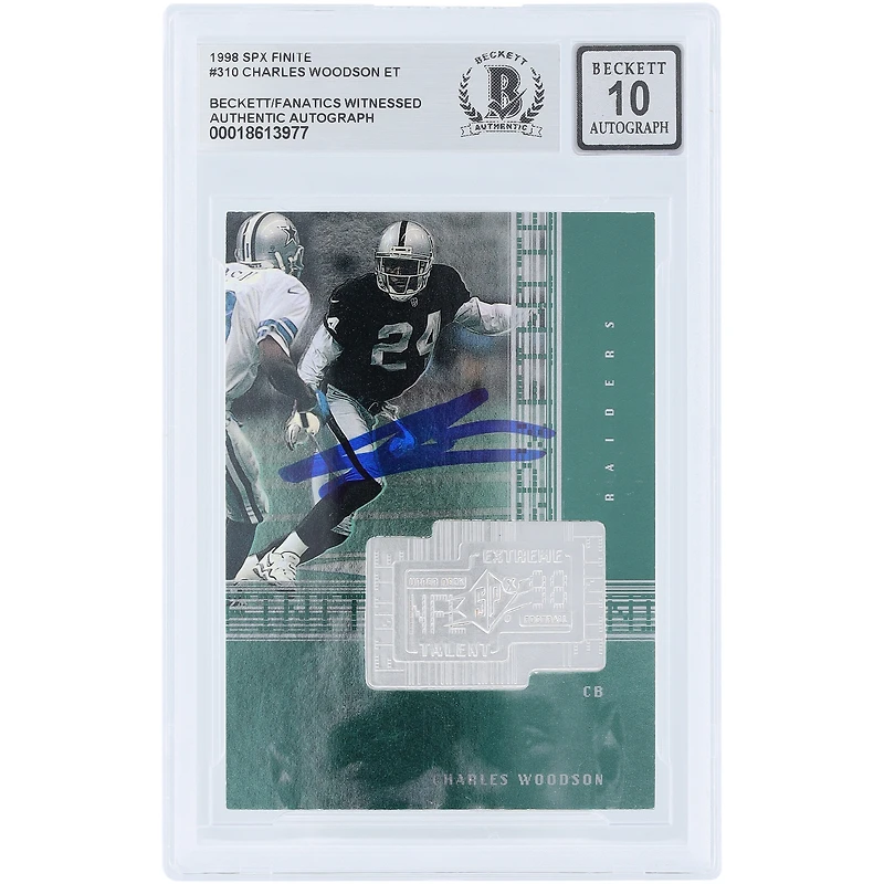 Carte de recrue 10 authentifiée par Charles Woodson (Oakland Raiders), 1998 Upper Deck SPx Finite, n° 310, numérotée sur 7200, et signée par Beckett Fanatics Witnessed.Carte de recrue 10 authentifiée par Charles Woodson (Oakland Raiders), 1998 Upper Deck SPx Finite, n° 310, numérotée sur 7200, et signée par Beckett Fanatics Witnessed.Carte de recrue 10 authentifiée par Charles Woodson (Oakland Raiders), 1998 Upper Deck SPx Finite, n° 310, numérotée sur 7200, et signée par Beckett Fanatics Witnessed.