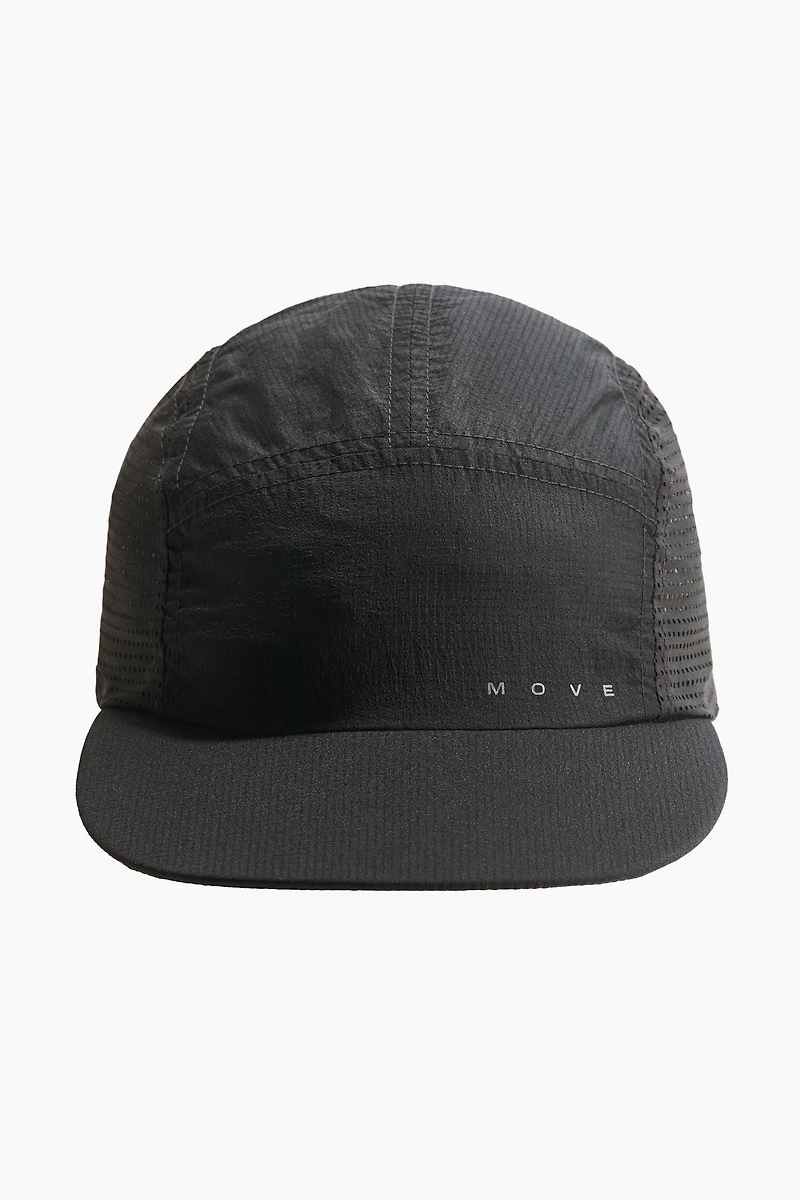 Casquette de course en nylon. Modèle avec partie en filet aéré de chaque côté et cordon de serrage réfléchissant muni d'un arrêt en plastique sur l'arrière.