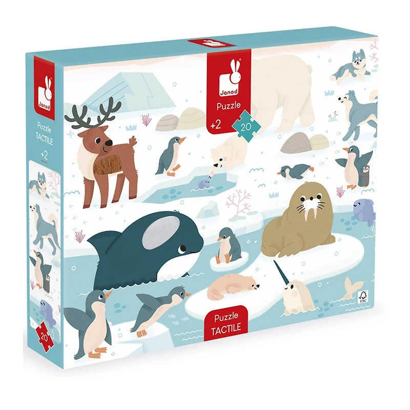 Les enfants vont adorer ce puzzle tactile géant sur le thème des animaux polaires. Après avoir réalisé un beau puzzle de 20 pièces, ils pourront découvrir différentes textures et matières un peu partout sur le puzzle et développeront ainsi leur sens du toucher et de l'observation. Poils du renne, pelage de l’ours polaire et du morse, effet paillettes pour le poisson, plumes du manchot : de nombreuses imitations de textures sont à explorer du bout des doigts ! Livré avec un poster servant de modèle pour les petits débutants, ils pourront ensuite réaliser leur puzzle sans modèle lorsqu'ils gagneront en autonomie. Dans son format 65 x 50 cm, ce puzzle est composé de 20 pièces, dont 7 pièces texturées. Les puzzles sont fabriqués à partir de carton certifié FSC™.