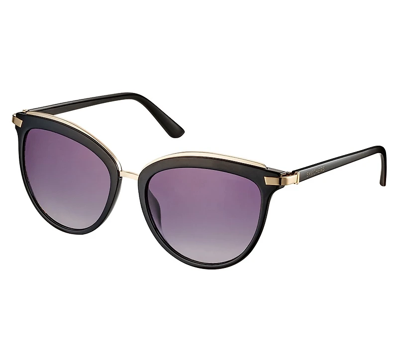 Elevate your everyday style with Skechers Cateye Classic Sunglasses. This sophisticated pair features a sleek black frame with gold metallic accents, classic cateye silhouette, and gradient purple lenses that add a pop of color to any look. Includes a Skechers pouch that also doubles as a cleaning cloth.