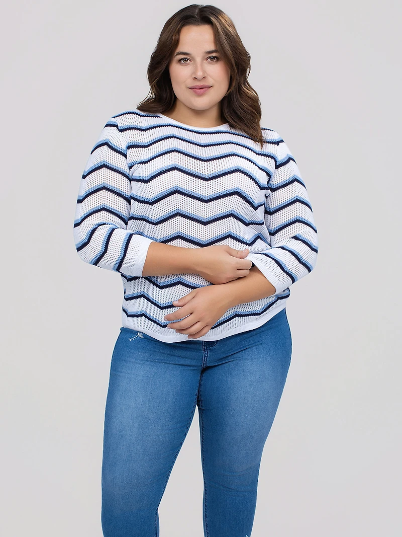 Chandail en tricot à motif zigzag contrasté, doté d’un col rond. Il présente des manches longues et des finitions côtelées au col, aux poignets et à la base.