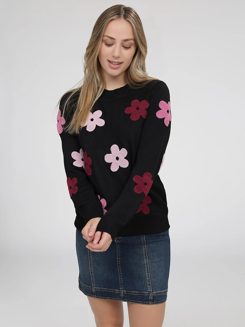 Le pull est réalisé en tissu tricoté avec des motifs floraux en contraste sur le devant. Il présente une encolure ronde, des manches longues et des finitions côtelées au col, aux poignets et à l’ourlet.