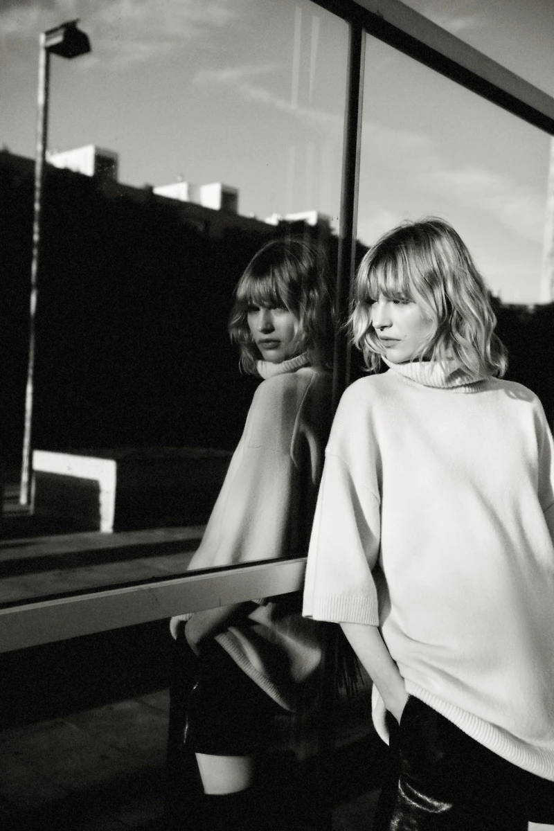 Chandail long en tricot de laine fine. Modèle grande taille avec col roulé côtelé, emmanchures fortement descendues et manches mi-longues. Finition côtelée en bas de manche et au bas.