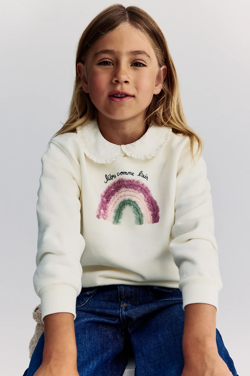 Chandail en molleton à l'intérieur doux et brossé. Modèle avec bande côtelée autour de l'encolure ronde et manches longues. Finition côtelée aux poignets et au bas.