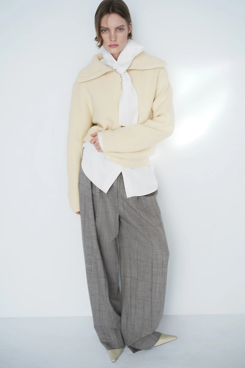 Chandail en tricot doux. Modèle avec col droit montant et fermeture éclair en haut. Emmanchures descendues et manches longues. Finition côtelée aux poignets et au bas.