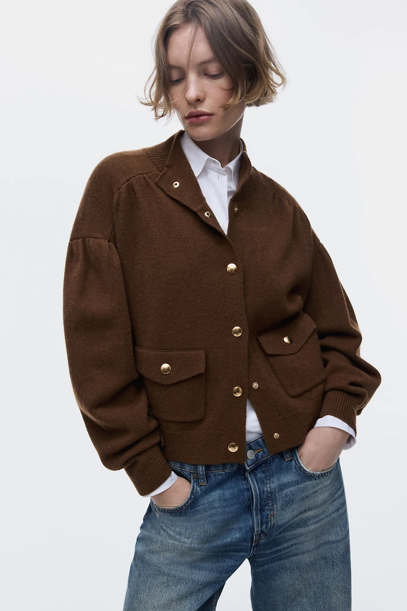 Chandail en tricot doux. Modèle grande taille avec col droit côtelé et fermeture par boutons-pression devant. Coutures d'épaule décalées vers l'avant et emmanchures descendues. Empiècement souligné de fronces dans le dos. Poches à rabat pressionné devant. Bas avec patte pressionnée de chaque côté. Finition côtelée aux poignets et au bas.