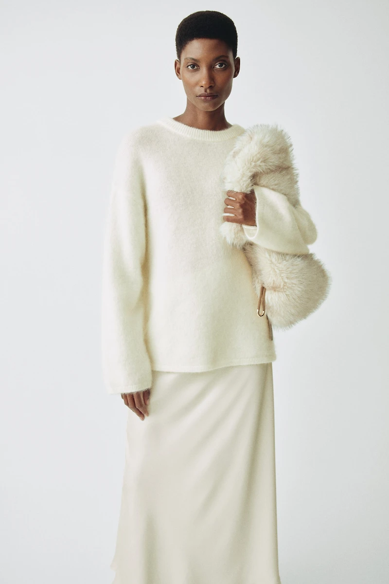 Chandail en doux tricot enrichi d'une touche de mohair et de laine. Coupe ample avec emmanchures tombantes et manches longues. Finition côtelée à l'encolure, aux poignets et au bas.