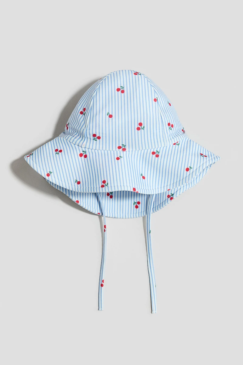 Chapeau de soleil en textile UPF 50 protégeant des UV. Modèle avec liens à nouer sous le menton et prolongement sur l'arrière pour protéger la nuque.