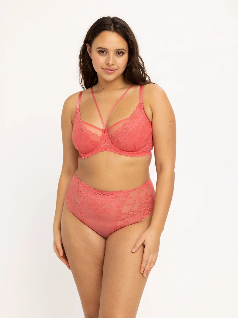Charlize Full Shaper est un soutien-gorge très confortable et d'un grand soutien, avec une large ceinture, conçu spécialement pour les poitrines plus larges. Le soutien-gorge a des armatures mais pas de rembourrage. Ce soutien-gorge de couleur corail présente de nombreux détails magnifiques et sensuels, comme les bretelles entre les seins qui se prolongent jusqu'à l'arrière du soutien-gorge. Les bretelles supplémentaires sont amovibles.