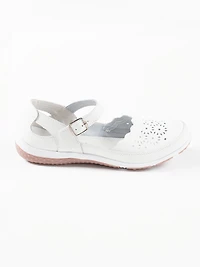 Chaussure basse perforée avec design floral, soulignée par une découpe ondulée sur le bord. Attache latérale par boucle métallique et semelle souple à relief antidérapant.