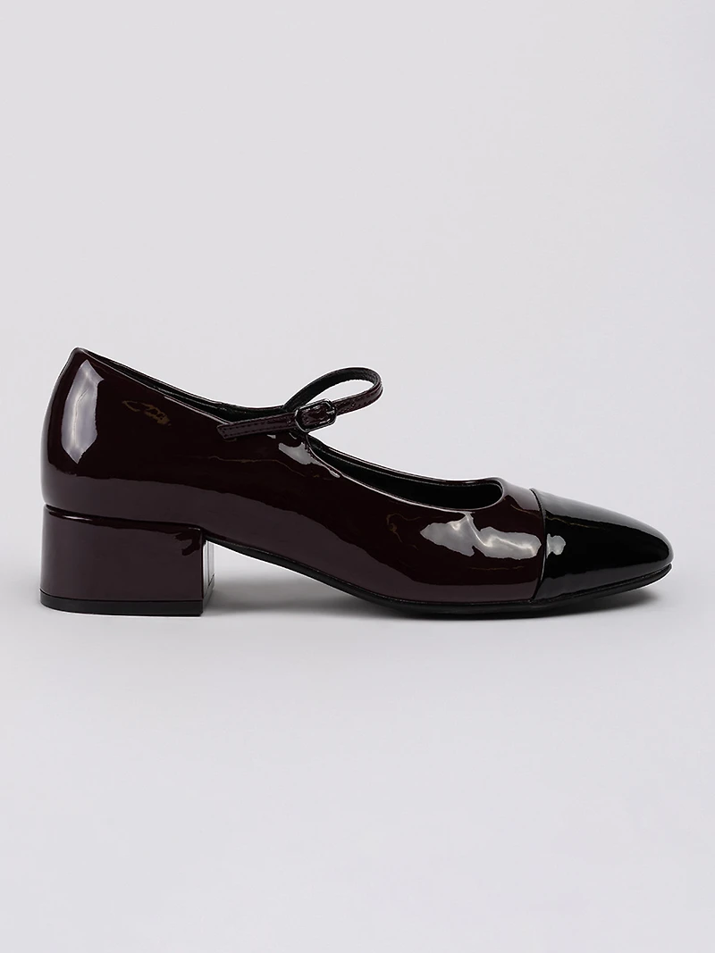 Chaussure à talon bloc de hauteur moyenne avec finition brillante. Le modèle est doté d’une bride fine sur le cou-de-pied et d’un bout légèrement arrondi.