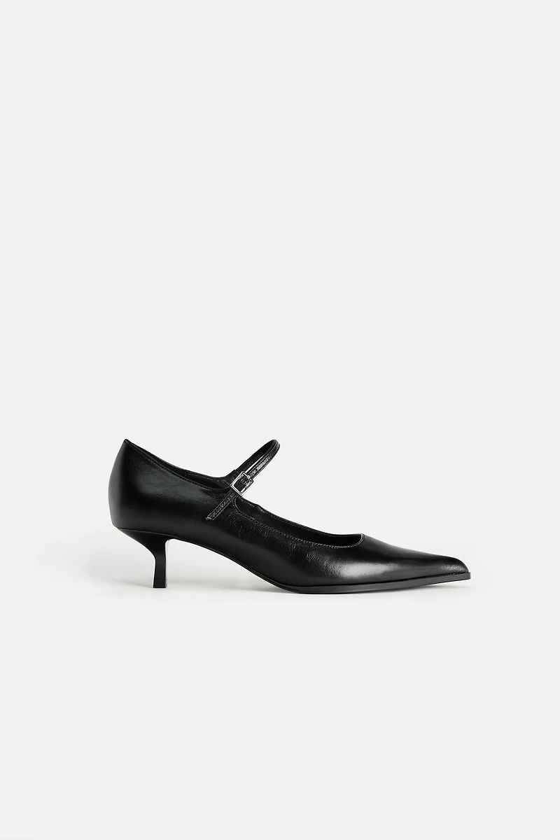 Chaussures en cuir. Bride avant avec boucle en métal. Petit talon. Bout pointu.