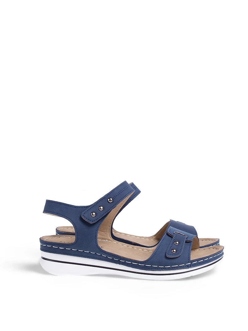 Sandales avec bride avant ornée d’un passant métallique et de rivets. Modèle à talon ouvert doté d’une attache auto-agrippante. Elles sont également ajustables à l’avant au niveau des orteils et reposent sur une semelle extérieure épaisse à ligne contrastée.