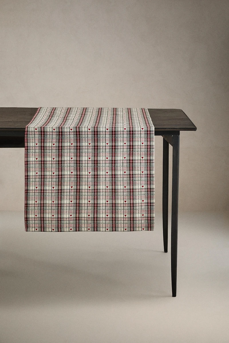 Chemin de table en coton à motif à carreaux et petits cœurs en fil teint, pour Noël.