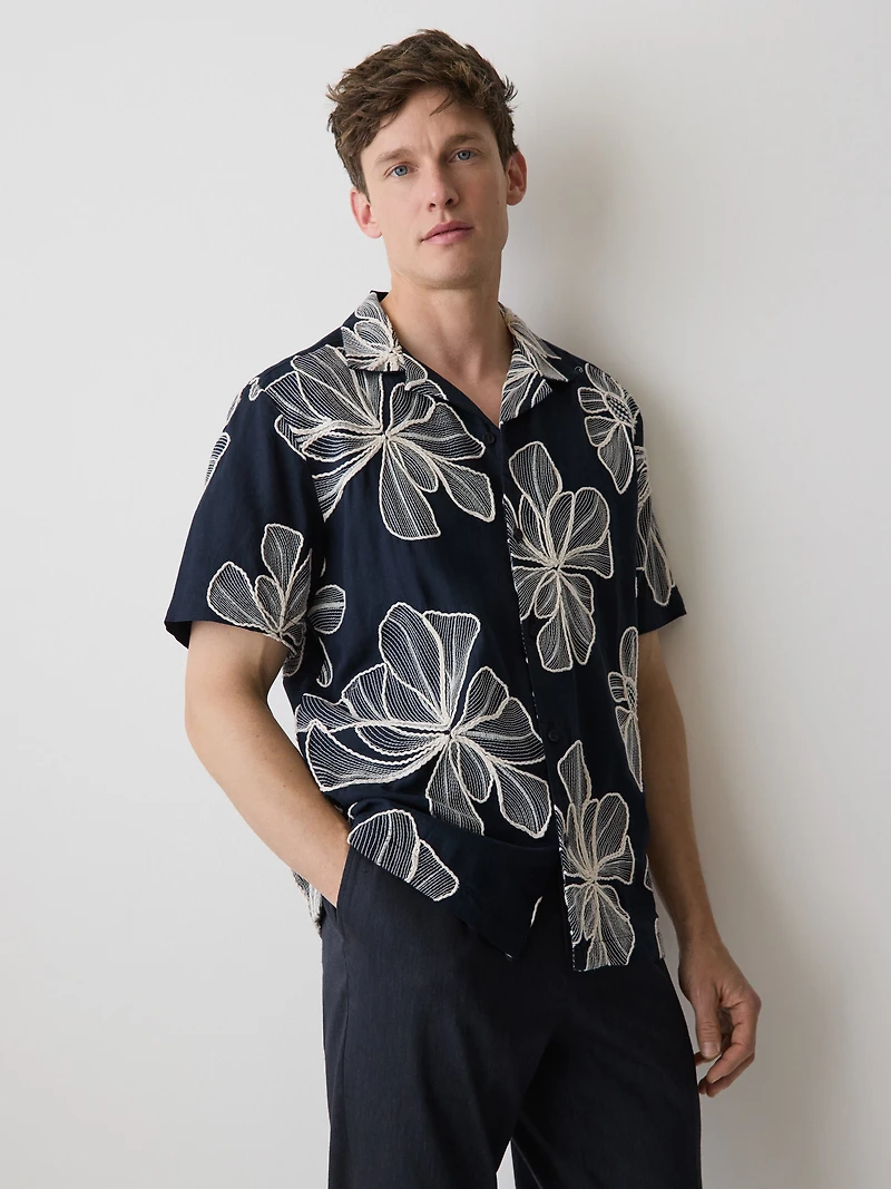 Décorée d'uniques détails brodés, cette chemise à manches courtes dotée d'un col camp est une pièce essentielle si vous désirez vous faire remarquer lors de vos prochaines vacances au soleil.
