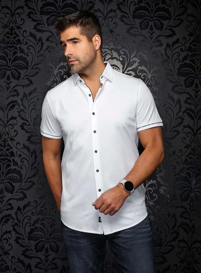 DESCRIPTION- Coupe semi-ajustée- Manches courtes- Tissu extensible- Coton satiné- Motif imprimé- Col semi-évasé- Col intérieur imprimé- Boutonnière intérieure contrastante- Poignets intérieurs imprimé- Sans poche MATÉRIEL65% Coton et 35% Polyester ENTRETIENLaver à la machine à l'eau froideSuspendre pour sécher