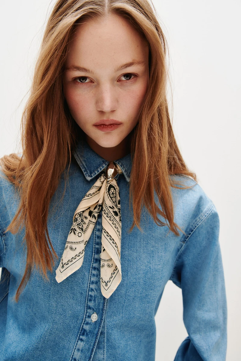 Chemise en denim très doux et léger. Modèle ample avec col et boutonnage devant. Emmanchures tombantes et manches longues terminées par fente et poignet boutonné. Empiècement dans le dos. Base arrondie.