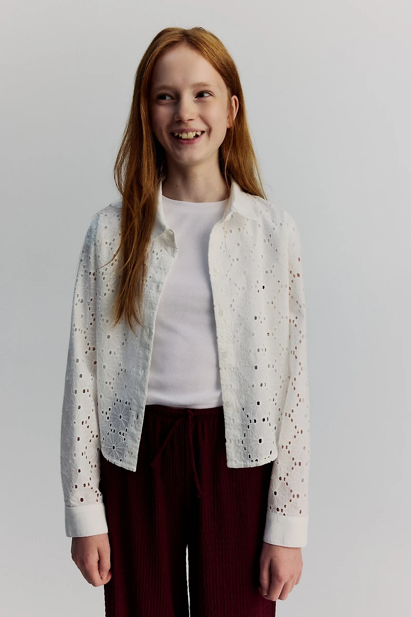 Chemise en tissu de coton doux. Coupe flottante avec col rabattu et boutonnage devant. Manches longues terminées par poignet boutonné.