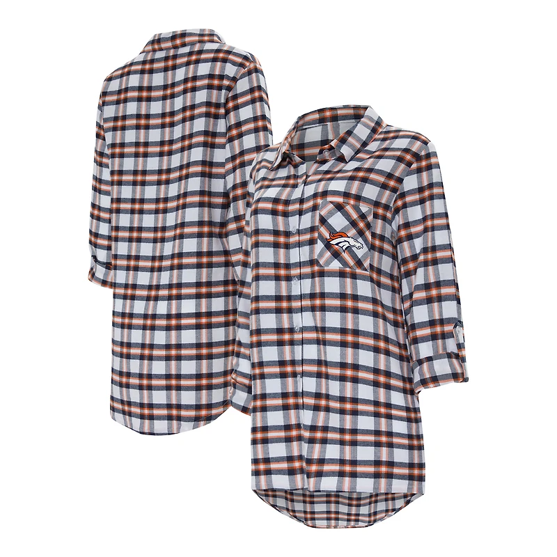 Montrez votre fandom inébranlable alors que vous rêvez de victoires des Broncos de Denver avec cette chemise de nuit à boutons complets Sienna de Concepts Sport. Il présente le logo de l'équipe brodé sur la poitrine et un motif à carreaux tissé dans leurs couleurs emblématiques. Des manches pin-up et un ourlet arrondi font de ce haut Denver Broncos un endroit idéal pour s'endormir avec style.