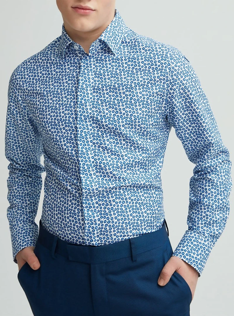 Description: Cette chemise à manches longues pour homme présente des imprimés et des bordures contrastées, parfaits pour une coupe semi-ajustée qui exsude le style !