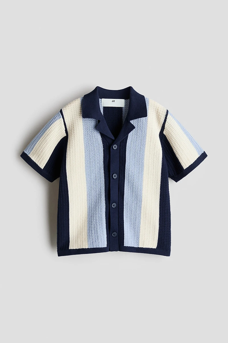 Chemise en fin tricot de coton doux. Modèle à col cubain et boutonnage devant. Emmanchures tombantes et manches courtes. Finition côtelée en bas de manche et au bas.