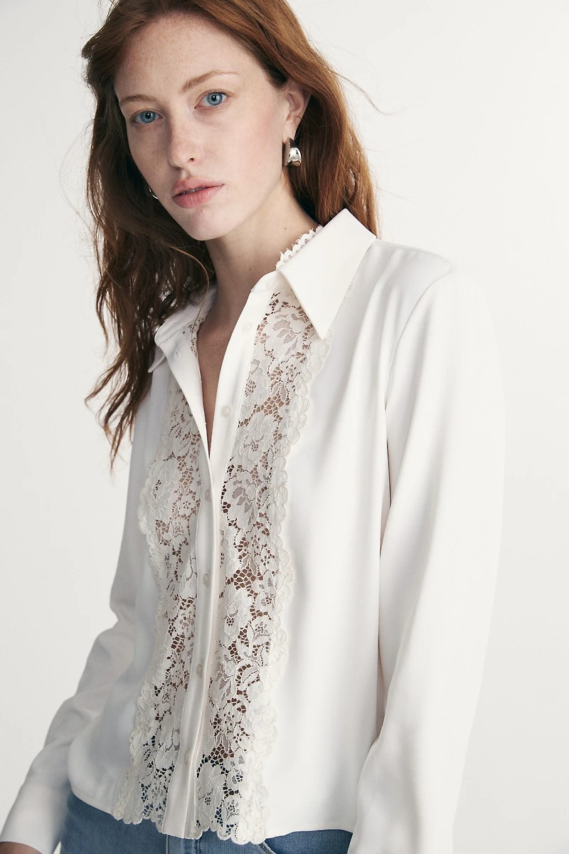 Apportez une touche d’élégance à votre garde-robe avec cette chemise ornée d’un délicat empiècement en dentelle florale sur le devant. Confectionnée dans un tissu fluide et doux, elle allie féminité intemporelle et coupe moderne. Son col structuré et sa patte de boutonnage contrastent subtilement avec la finesse de la dentelle, pour un rendu raffiné. Facile à porter, elle se marie aussi bien avec un jean qu’avec un pantalon habillé, et vous accompagne parfaitement du jour au soir.