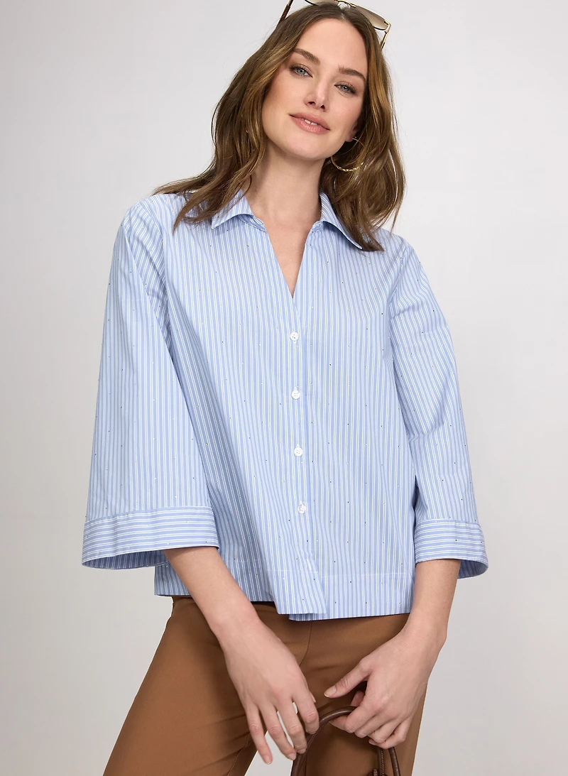 Portez ce chemisier élégant et scintillant pour un look chic et contemporain. Associez-le à un pantalon tailleur et à un sac structuré pour compléter la tenue.Motif à rayuresEncolure fendueManches 3/4 évaséesDétails ornés de pierresFermeture à boutonsMatière en mélange de cotonLongueur plus courte