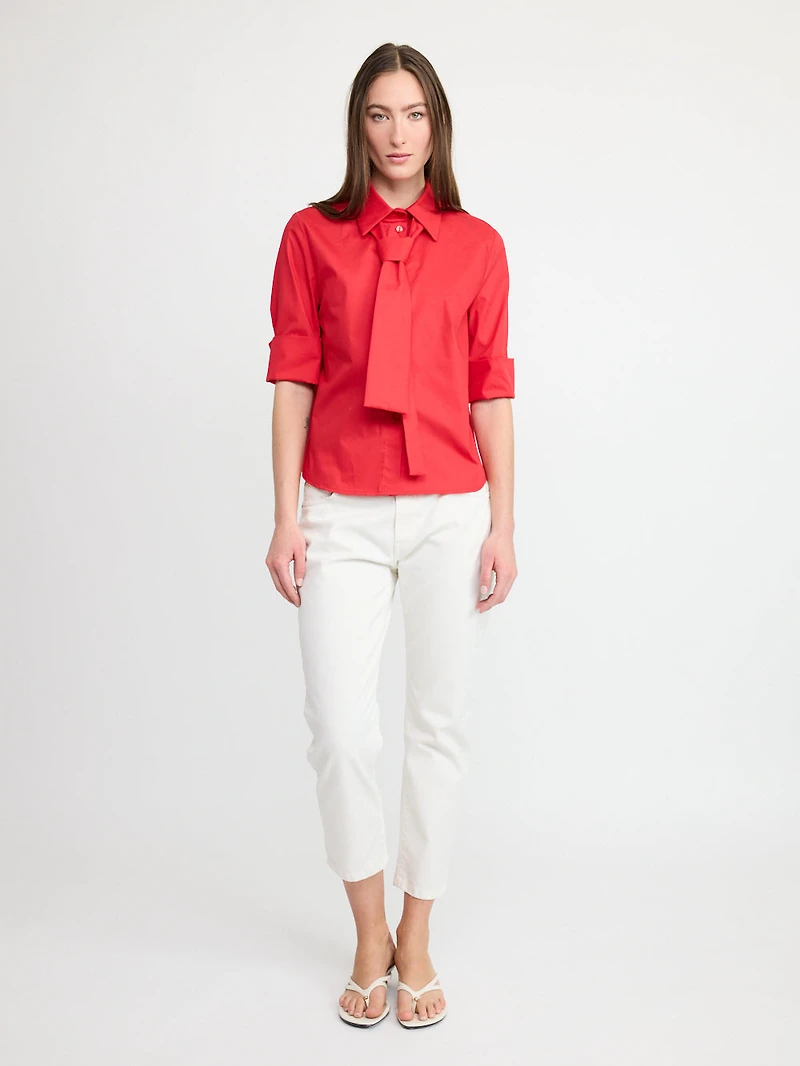 Statement button-up shirt featuring a classic collar and a removable tie detail at the neckline for a refined, feminine touch. Designed with a relaxed silhouette and three-quarter sleeves for an effortlessly elegant look. Perfect for styling with tailored trousers, skirts, or denim for both work and evening outfits.