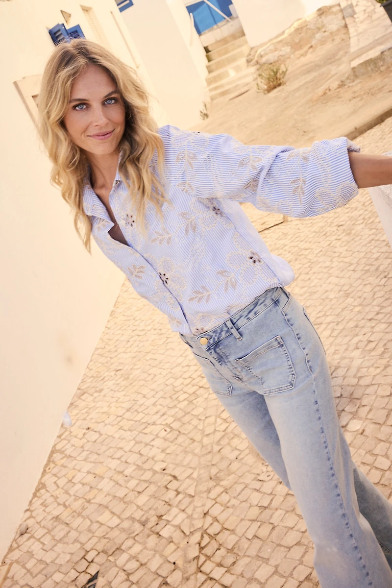 Chemisier rayé boutonné aux fleurs brodées - Tramontana