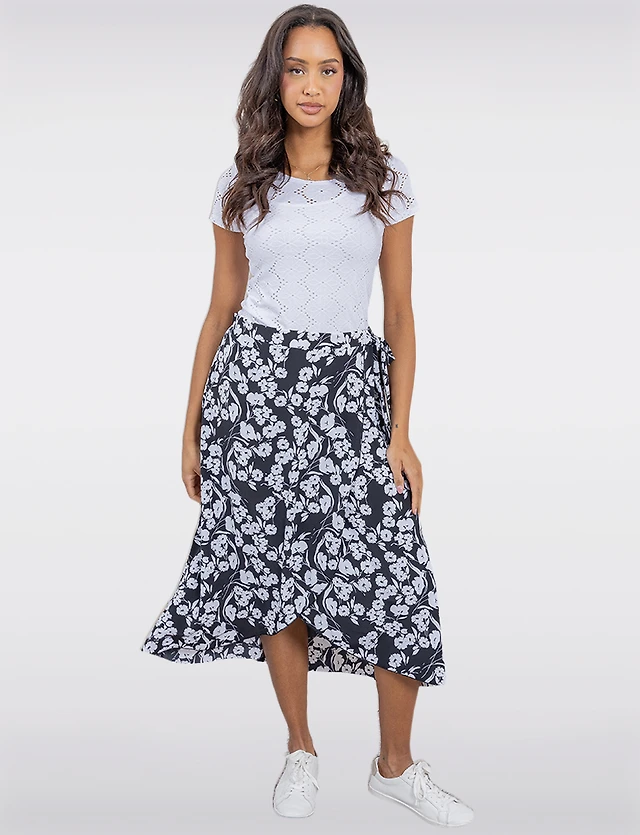 Chic Floral Black & White Faux Wrap Skirt with Side Tie by Vamp