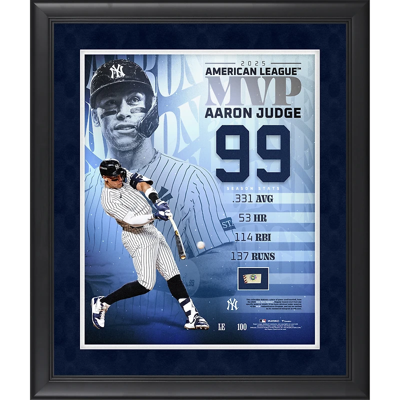 Commemorate Aaron Judge's incredible season with this Framed 16" x 20" 2025 American League MVP Collage. The superstar slugger dominated at the plate all season long to earn himself this remarkable title as his league's Most Valuable Player. Featuring striking details to celebrate the iconic award, this collectible is the perfect way to showcase your Aaron Judge and New York Yankees fandom.