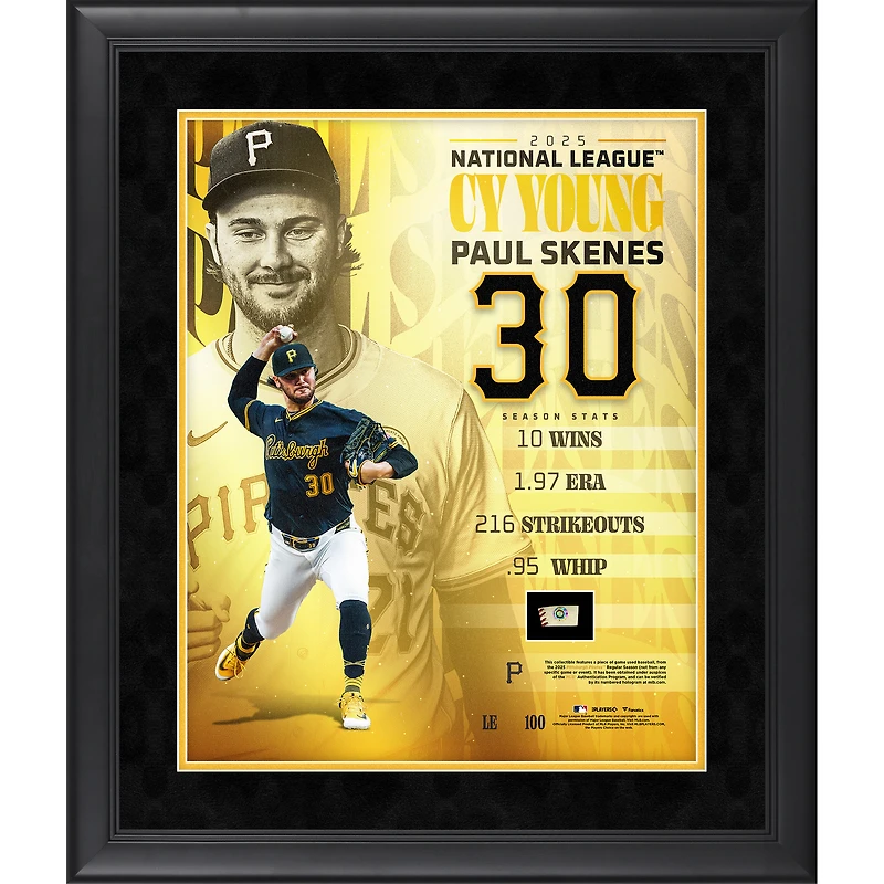 Collage encadré 40,6 x 50,8 cm (16 x 20 pouces) de Paul Skenes, Pittsburgh Pirates, trophée Cy Young 2025 de la Ligue nationale, avec un morceau de balle utilisée en match - Édition limitée à 100 exemplaires