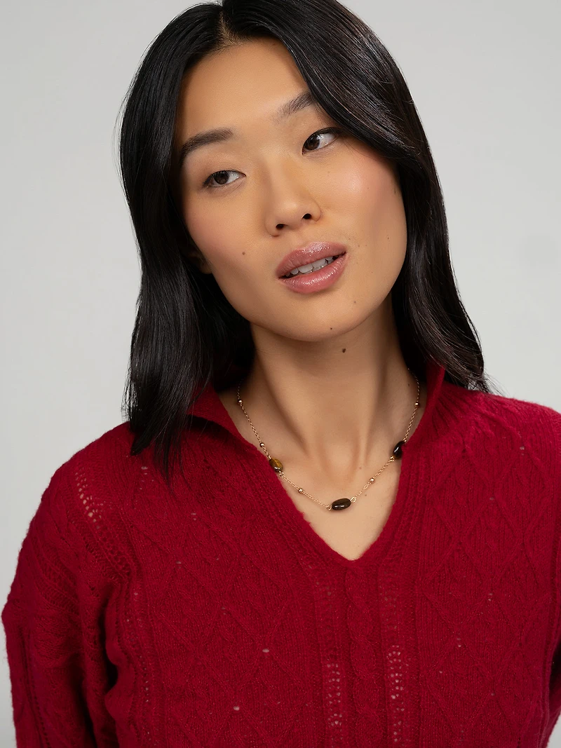 Collier de chaîne fine orné de perles ovales lisses disposées à intervalles réguliers. La construction présente une ligne épurée avec éléments décoratifs intégrés directement à la chaîne.