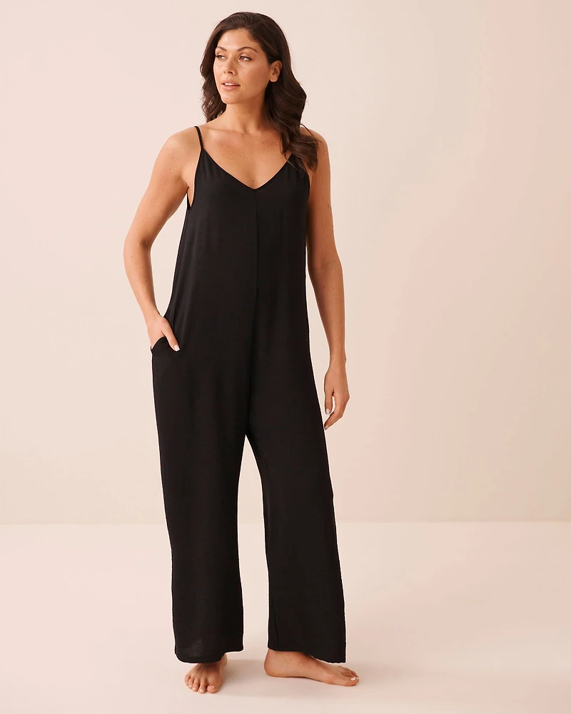 En primeur : dès maintenant en ligne! Une allure élégante, même dans la détente. C'est la promesse de ce vêtement d'intérieur. Avec sa texture froissée loin de paraître négligée, cette combinaison habille d'un tombé fluide.