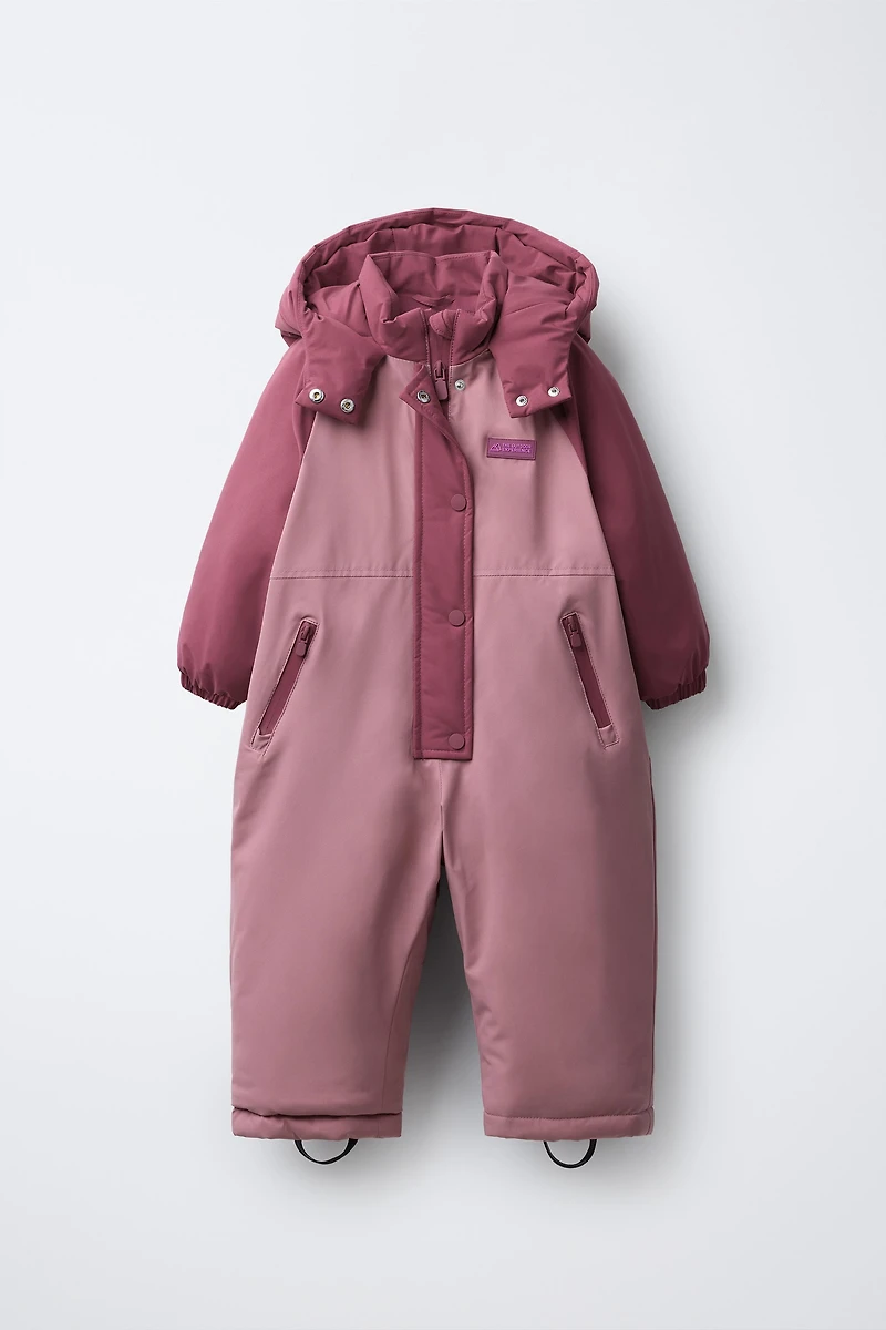 Combinaison longue avec un tissu spécial déperlant, avec capuche avec fermeture à boutons, col montant et manches longues finies en élastique. Fermeture zippée frontale thermosoudée dissimulée par un rabat et des boutons-pression. Poches avant avec fermeture zippée thermosoudée et doublure intérieure en tissu polaire. Étiquette autocollante appliquée sur la poitrine. Bas fini par un poignet intérieur élastique à insérer dans les chaussures pour éviter l'entrée de la neige et du froid. Détail bande réfléchissante dans le dos.