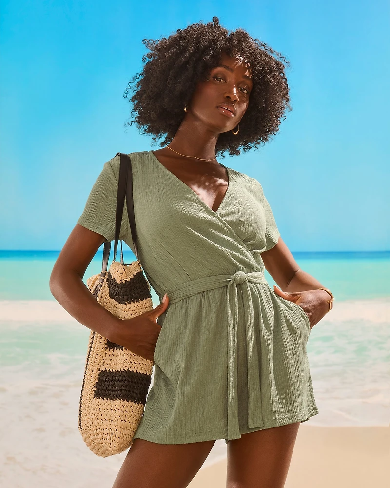 Cette combinaison texturée de MyBikiniStory incarne à la fois confort et élégance, parfaite pour celles qui cherchent un style raffiné et pratique. Confectionnée dans un tissu texturé de couleur vert végétal, cette pièce à enfiler offre une silhouette flatteuse et un confort optimal. Son encolure en V, subtilement élégante et ses manches courtes ajoutent une touche de légèreté, tandis que la taille élastique, accompagnée d’une ceinture amovible, permet un ajustement personnalisé et accentue la taille pour une allure féminine. Les poches latérales pratiques ajoutent une touche de fonctionnalité à ce design moderne, tandis que le chevauchement au centre de la combinaison apporte une dimension originale et tendance. Parfaite pour celles qui recherchent un équilibre entre style intemporel et modernité, elle est idéale pour un look de plage élégant tout en offrant la liberté de mouvement.
