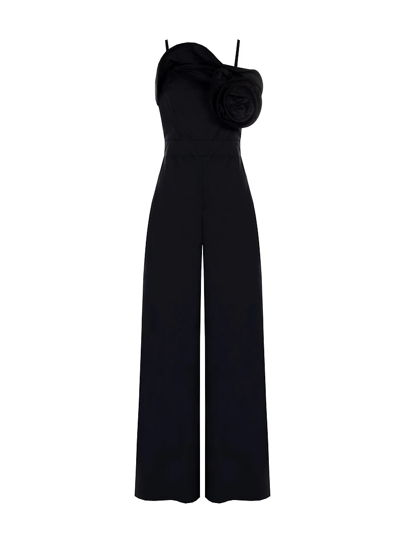 Sublimez votre garde-robe de soirée avec cette combinaison-pantalon noire sophistiquée à jambes larges – une alternative moderne aux tenues de soirée traditionnelles. Sa caractéristique la plus frappante est un corsage architectural orné d'une spectaculaire rosace en tissu 3D et d'un volant sculptural oversize qui s'étend asymétriquement sur le décolleté.
