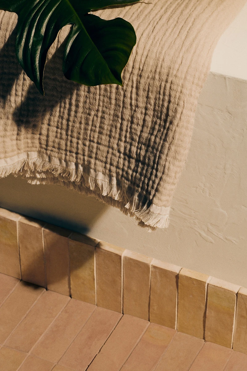 Couverture douillette en mousseline de coton. Modèle avec petites franges sur le pourtour.