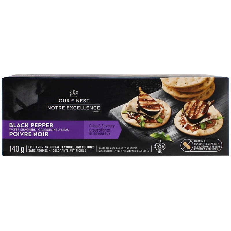 Rehaussez votre prochain plateau de charcuterie avec les craquelins à l’eau au poivre noir Notre Excellence. Fièrement fabriqués au Canada à partir d’ingrédients canadiens et importés, ces craquelins à l’eau ont un goût léger et beurré accentué par une touche parfaite de poivre concassé piquant. Sans arômes ni colorants artificiels et fabriqués dans une usine exempte d’arachides, ces craquelins collation peuvent être partagés en toute sécurité avec vos amis et vos proches. Servez-les lors d’une fête avec vos fromages, viandes, trempettes et tartinades préférés pour un hors-d’œuvre que vos invités adoreront. Ou mangez-en quelques-uns pour une collation pratique et satisfaisante.
