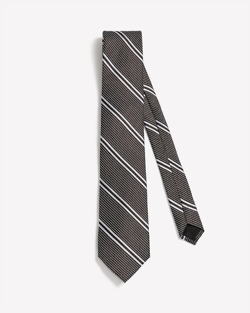 Rehaussez votre look avec cette cravate régulière entièrement conçue en soie brune et décorée d'un discret motif à rayures - 100% soie - Largeur de 3"