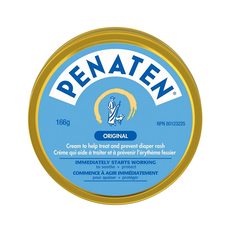 La crème médicamenteuse Penaten, formule originale, commence à agir instantanément pour apaiser et protéger la peau. Ce soin médicamenteux contient 18,7 % d’oxyde de zinc pour aider à traiter et prévenir l’érythème fessier. Il peut être utilisé à chaque changement de couche pour aider à prévenir l'érythème fessier. À base d’oxyde de zinc comme ingrédient actif pour protéger temporairement la peau et apaiser les irritations cutanées mineures dues à l’érythème fessier. La crème Penaten peut également être utilisée pour protéger la peau irritée par l’érythème fessier et aider à repousser la moiteur qui peut provoquer l’érythème. Cette crème est offerte en format de 166 g. Mises en garde : Pour usage externe seulement. Lorsque vous utilisez ce produit évitez tout contact avec les yeux. En cas de contact, rincer à grande eau. Cesser l’emploi et consulter un médecin si les symptômes s’aggravent ou durent plus de 7 jours, ou si de nouveaux symptômes apparaissent. Garder hors de la portée des enfants. En cas d’ingestion, appeler un centre antipoison ou obtenir des soins médicaux immédiatement. Ne pas utiliser en cas d’allergie à l’un des ingrédients. Mode d’emploi : Appliquer généreusement sur la peau propre et sèche à chaque changement de couche, au besoin.Ne pas utiliser si le sceau de sécurité manque ou est brisé. Conserver entre 15 et 30 °C.