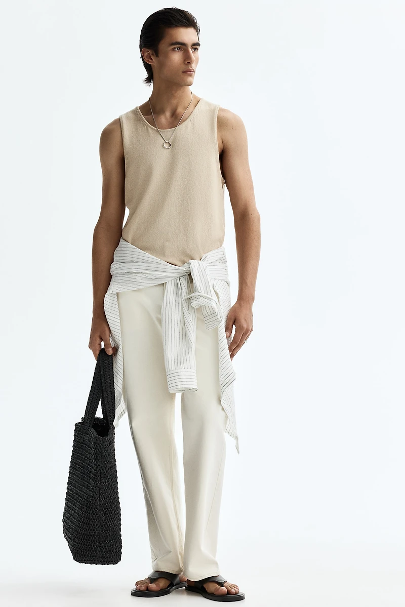 Débardeur en tricot de coton mélangé. Modèle à encolure ronde plongeante, emmanchures larges et bas droit. Coupe classique pour une silhouette classique et un plus grand confort.